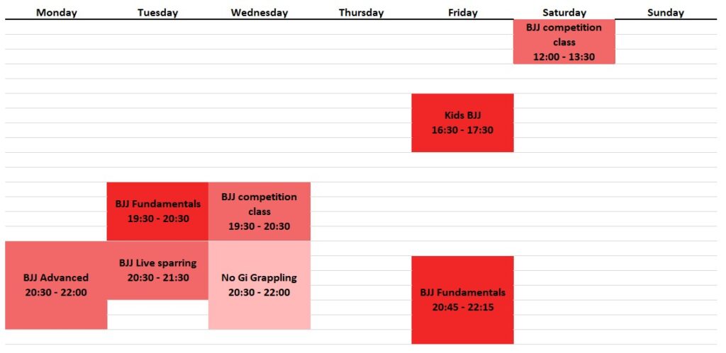 We offer classes from Monday through Saturday for various skill levels. Each class is roughly structured to contain a warm-up, practicing of techniques with a partner, and sparring. BJJ classes require a Gi. If you want to join a free try-out class, you can borrow a Gi from us or participate in shorts (without pockets) and a t-shirt. No Gi Grappling classes require shorts (without pockets) and a rashguard (or t-shirt if you join the No Gi class as a try-out class).